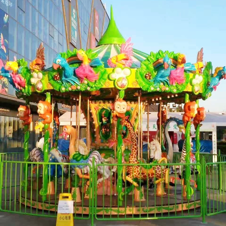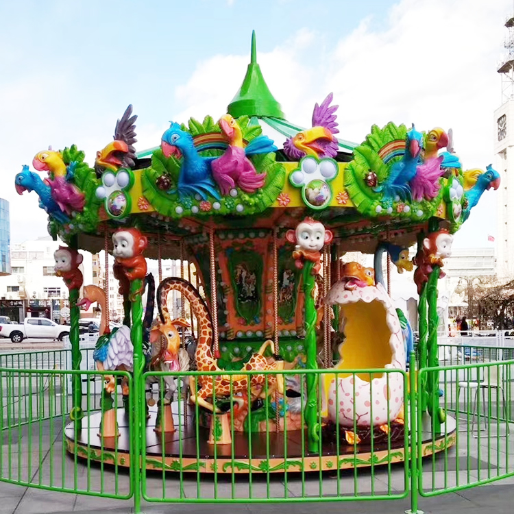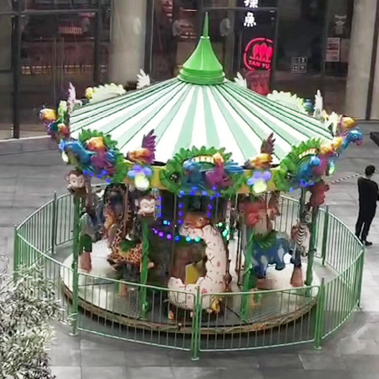 1. Simple and classic forest-style FRP design;. 2. Unique forest lighting effects;. 3. Rotating clockwise and undulating, with 12 rides, designed for all playgrounds, plazas, large shopping malls, etc., providing visitors with fun carousels.