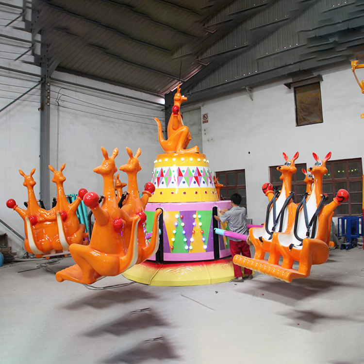 Hotfun’s newest family and tweener ride, the “Kangaroo jump – It’s a blast of family fun!”, packs a powerful punch of fun as it takes riders on a “land down under” bouncing adventure. Riders sit side by side in kangaroo themed seats and are treated to a ride full of bounces and surprises. The Kangaroo jump comes in both and 8 arm 16 passengers and 12 arm 24 passenger versions and features the industry standard over the-shoulder safety restraints. Hotfun’s design team set out to develop a new generation family flat ride building on the popular jumper ride idea which would use time tested technology for a budget and maintenance friendly ride. The result is a compact circular ride with eye catching themeing to help you maximize your presence on the midway. Advanced noise reduction technology makes this soon to be outdoor favourite a great option for indoor venues. Treat your guests to a blast of family fun on the Kangaroo jump.