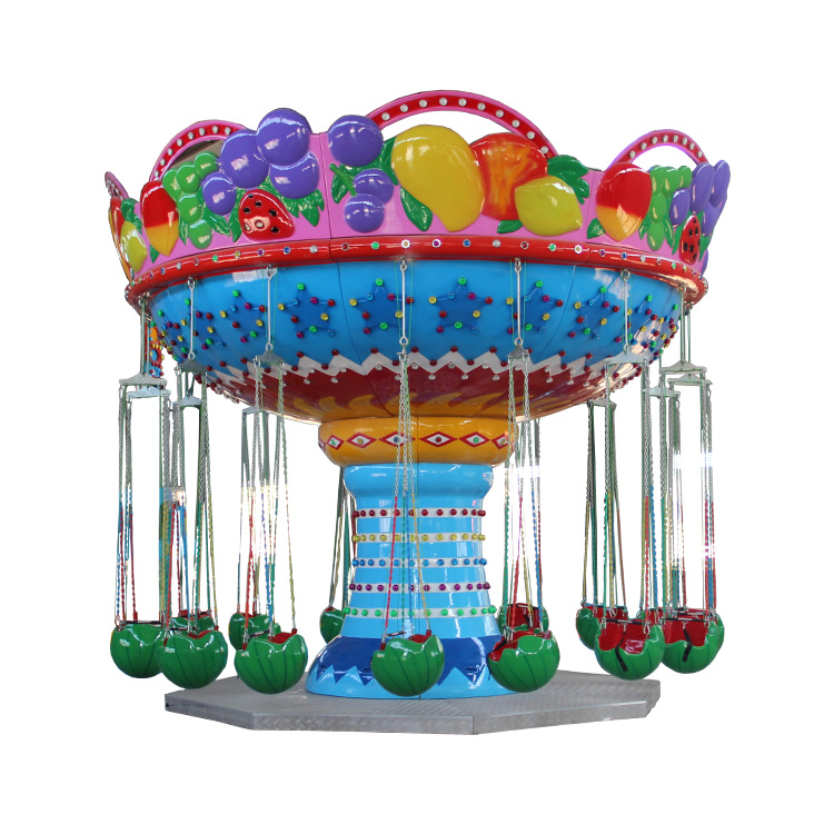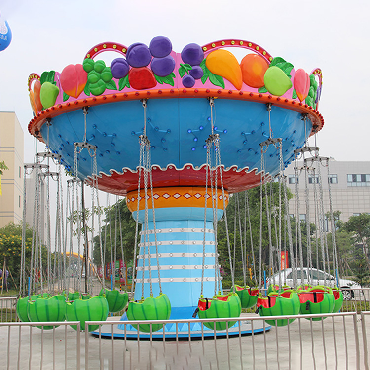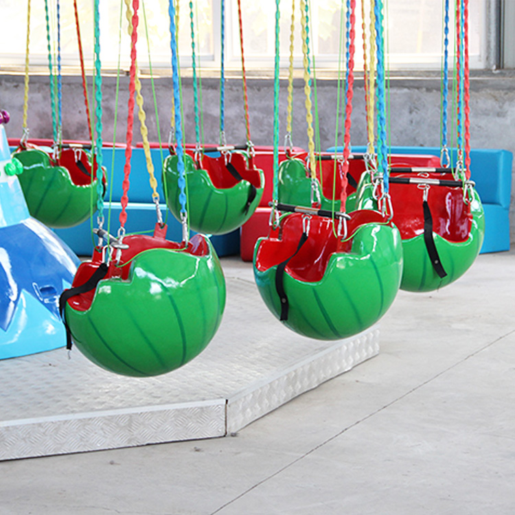 Fruit flying chair ride is based on the shape of watermelon flying chair shell, made of brightly colored glass steel. By the base, the main frame, column, track, lifting system, turntable,