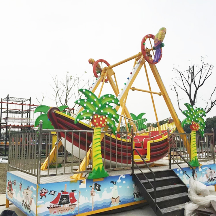 The mini pirate ship ride has another name of viking ship ride and is a kind of moderate thrill ride, consisting of an open, seated pirate ship which swings back and forth, subjecting the rider to various levels of angular momentum. The mini Pirate Boat in the pirate ship ride consists of a steel support structure which is made up of four uprights. The mini pirate ship ride can swing riders in the pirate ship back and forth, giving these riders a feeling of weightlessness. The mini pirate ship ride is a medium speed ride. On the pirate ship rides, riders can experience the unexpected changes in the elevation and speed of pirate ship, including moderate twists, turns, bumps, spins, and loops. The motor of pirate ship rides is controlled by powering the ride noiseless with automatic programs or manual option. You will have a thrilling feelings when you ride.